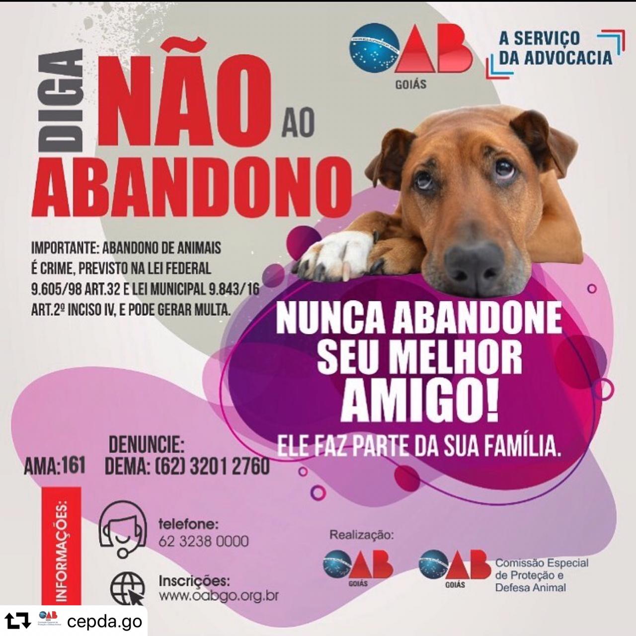 Em Goiânia, a Comissão Especial de Proteção e Defesa Animal da OAB/Go lançou no fim de junho a Campanha “Diga Não ao Abandono – Nunca Abandone Seu Melhor Amigo”.