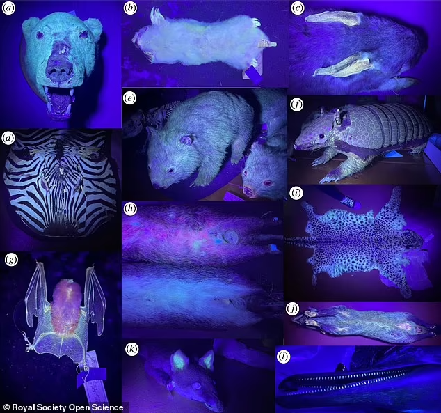 As áreas de fluorescência incluíam pelos brancos e claros, penas, bigodes, garras, dentes e alguma pele nua.