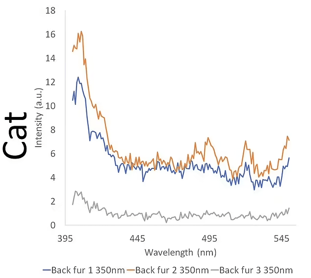 Para o gato doméstico, a pelagem escura não era fluorescente, mas a pelagem branca era, com intensidade semelhante à do ornitorrinco.