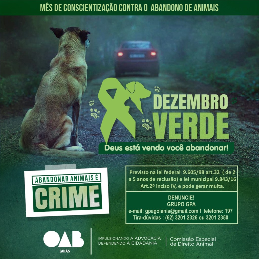“Dezembro verde é o mês dedicado a alertar e conscientizar que o abandono é crime, e que os animais sofrem muito ao serem abandonados, e dessa vez apelamos pra Deus para que a pessoa tenha consciência que seu ato é cruel e criminoso, pois normalmente a pessoa abandona em locais ermos, sem nenhuma movimentação, pensando que ninguém está enxergando, mas DEUS está vendo você abandonar, pense nisso” declara Pauliane Rodrigues, presidente da Comissão Especial de Direito Animal da OBA/GO sobre a Campanha Dezembro Verde.