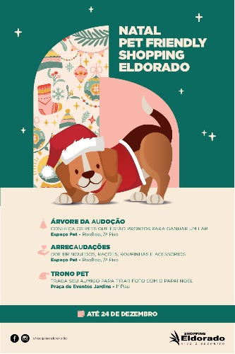 Em parceria com a ONG Cão Sem Dono, o objetivo da ação é encontrar novos lares para os pets da ONG. Até o dia 24 de dezembro, os visitantes do shopping encontrarão no Espaço Pet do Eldorado uma árvore com as informações e fotos dos pets da ONG que estão prontos para serem adotados.
